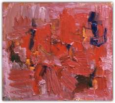 Red Shapes 1959 - 18”x20” Non-objective dense shapes painted expressively; a collection of bright red shapes organized in a rectangle and played against a lighter pinkish background.