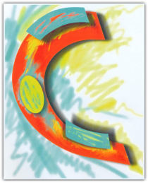 C Abstract 1994 - Digital Painting of abstract letter, which appears dimensional. Shapes are placed on the letterform to create 3D space. The image is painted expressively to show dynamic movement.